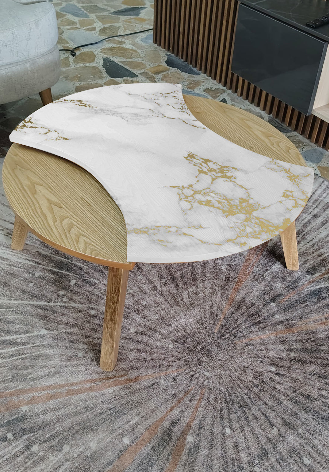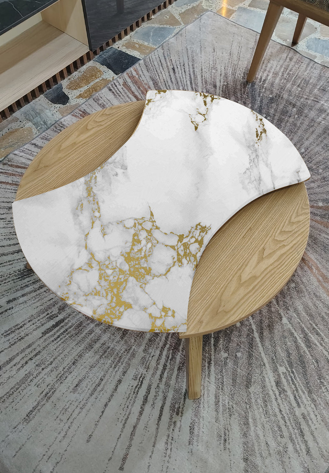Presentamos nuestra mesa de centro elaborada con madera Calacatta, reconocida por su veteado único y sofisticado, combinada con una tapa superior en piedra sinterizada, que aporta resistencia, durabilidad y un acabado premium.